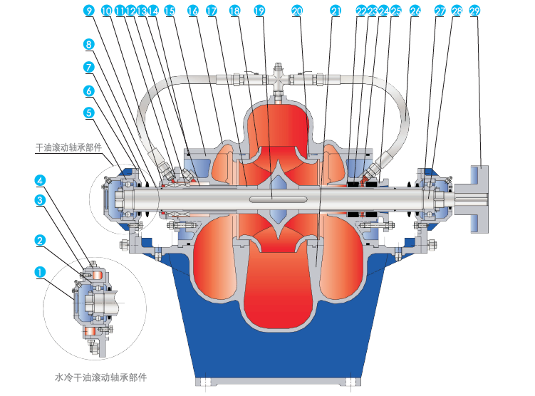 軸承具有水冷結(jié)構(gòu),能在較高溫度工況下使用。