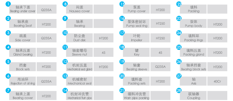 泵主要零部件材質(zhì)(不注明則按本樣本配置交貨);
