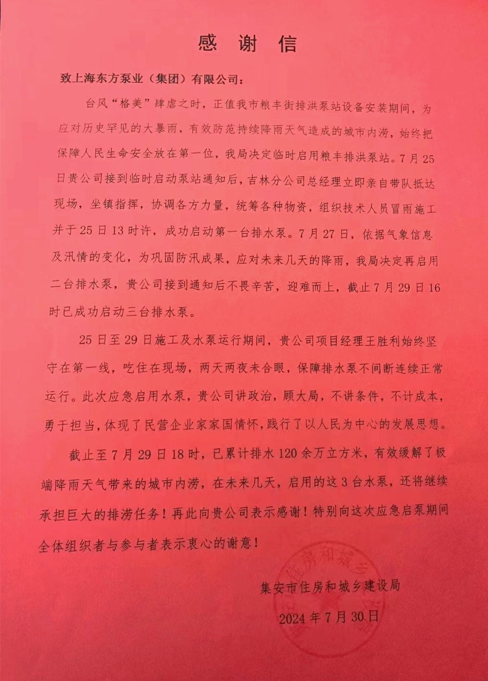 感謝信內(nèi)容信中提到,在臺(tái)風(fēng)“格美”帶來的歷史罕見暴雨期間,集安市糧豐街排洪泵站正處于設(shè)備安裝階段。為了防范持續(xù)降雨可能造成的城市內(nèi)澇,集安市住建局決定臨時(shí)啟用糧豐排洪泵站。接到通知后,東方泵業(yè)吉林分公司總經(jīng)理立即親臨現(xiàn)場(chǎng)坐鎮(zhèn)指揮,組織技術(shù)人員冒雨施工,于7月25日13時(shí)成功啟動(dòng)第一臺(tái)排水泵。隨著氣象信息和汛情的變化,東方泵業(yè)再次接到了啟動(dòng)第二臺(tái)和第三臺(tái)排水泵的通知,東方人不畏困難,迎難而上,截至7月29日16時(shí)已成功啟動(dòng)三臺(tái)排水泵。