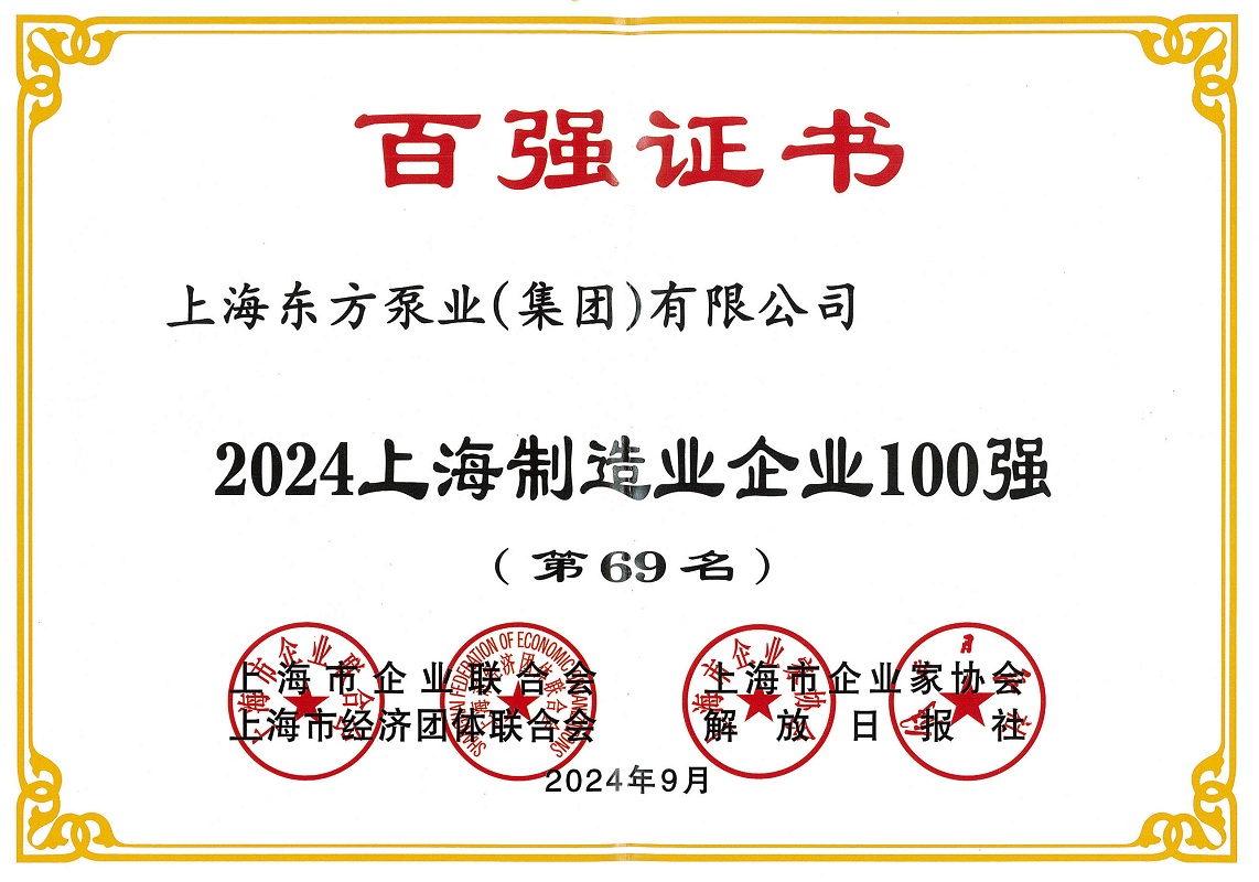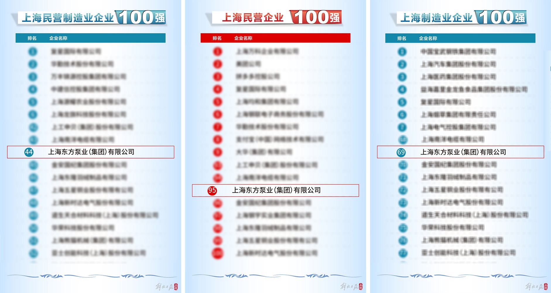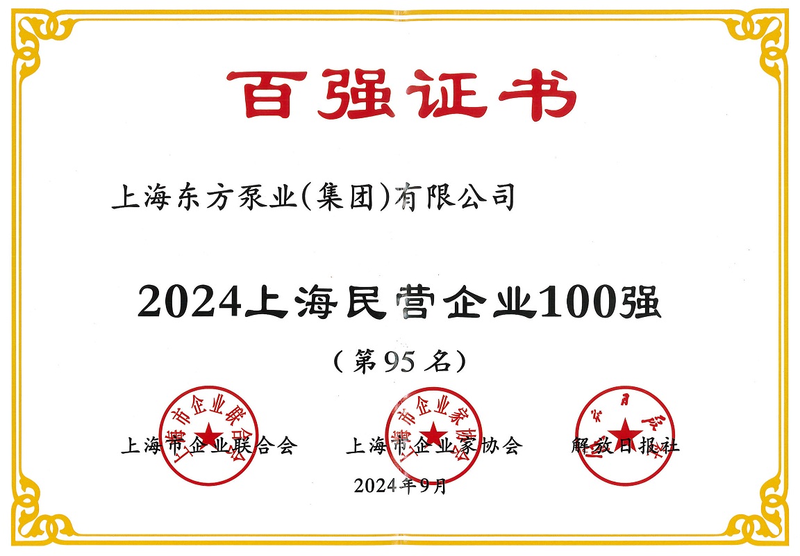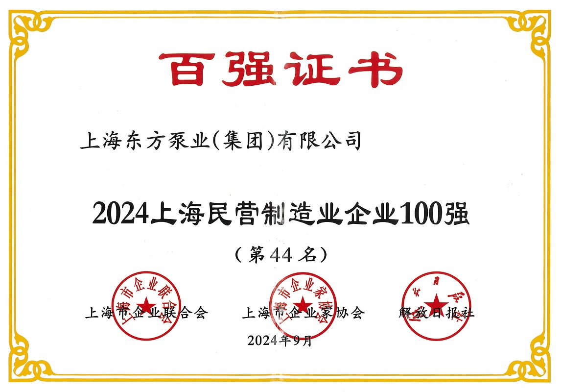近日,2024上海百?gòu)?qiáng)企業(yè)發(fā)布會(huì)順利召開(kāi)并發(fā)布了多項(xiàng)百?gòu)?qiáng)企業(yè)榜單。上海東方泵業(yè)(集團(tuán))有限公司在此次評(píng)選中榮獲2024上海民營(yíng)企業(yè)100強(qiáng)(第95名)、2024上海民營(yíng)制造業(yè)企業(yè)100強(qiáng)(第44名)、2024上海制造業(yè)企業(yè)100強(qiáng)(第69名)。