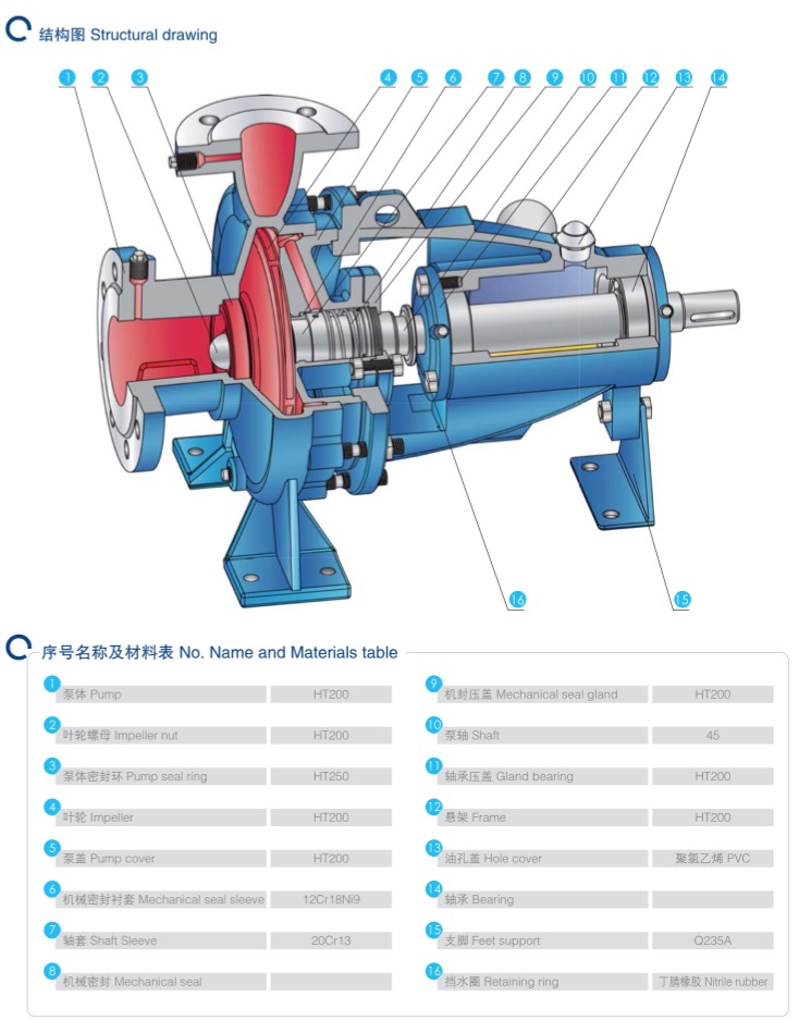 XA系列泵為單級(jí)單吸離心泵。該泵主要由泵體、泵蓋、葉輪、軸、軸套和懸架等部分組成。泵軸伸出端由兩個(gè)滾動(dòng)軸承支承,軸承用機(jī)器油或潤滑脂潤滑。填料函用軟填料或機(jī)械密封。泵通過彈性聯(lián)軸器由電動(dòng)機(jī)直接驅(qū)動(dòng)。