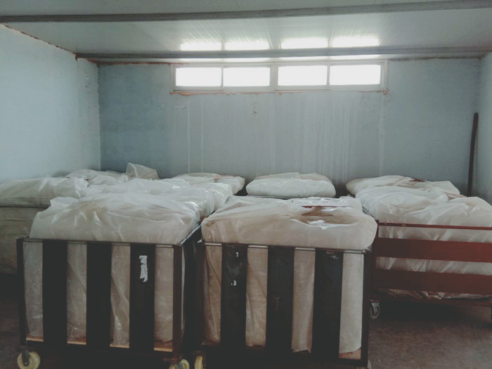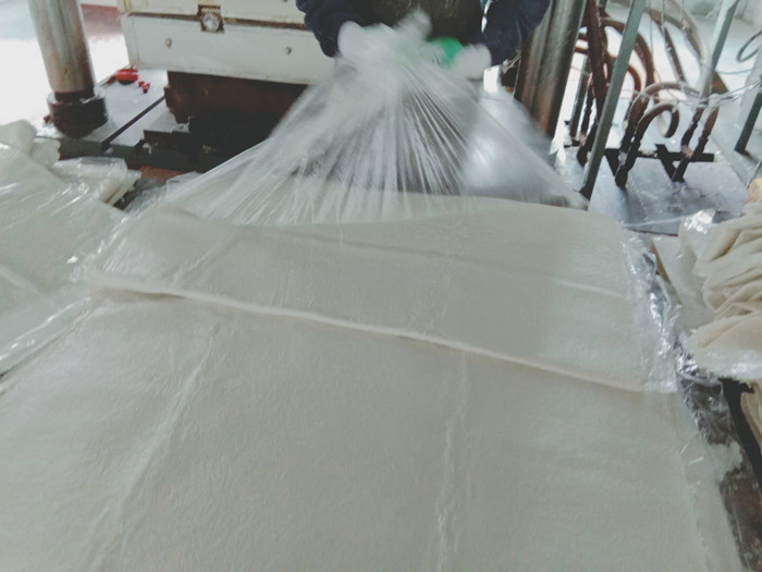 經(jīng)過熟化期的片材就可以放入模壓機進行模壓了,在模壓之前要嚴格稱重每塊水箱板需要的片材重量,以每塊水箱板都是標準重量。進入模壓機之前還要把包裹片材的塑料膜撕下,才能放入模壓機。
