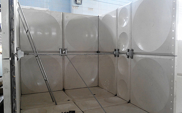 如果僅僅用水箱板和膠條組成我們需要尺寸的水箱,雖然不透水了,但是還不能盛水,因為盛水之后水箱會承受一個向外的張力,必須加上拉筋系統受力,否則玻璃鋼水箱會形成一個高力矩體系,很容易撐壞。