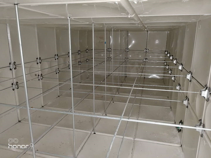 如果是用水箱板和膠條組成我們需要尺寸的水箱,雖然不透水了,但是還不能盛水,因為盛水之后水箱會承受一個向外的張力,必須加上拉筋系統受力,否則玻璃鋼水箱會形成一個高力矩體系,很容易撐壞。拉筋系統有圓鋼,內外拉筋板,對拉螺栓。