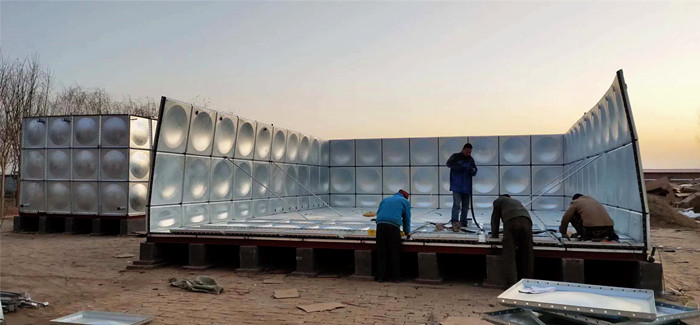 2.安裝水箱,在水箱板安裝之前,同樣按照發(fā)貨清單依次清點(diǎn),底板,側(cè)板及蓋板的數(shù)量及打孔是否正確。開始組裝底板,把板依次擺好,板與板中間夾好橡膠條,穿上螺栓,用電動扳手吧螺絲緊固好,把底板連接起來,放在焊好的槽鋼底座上。