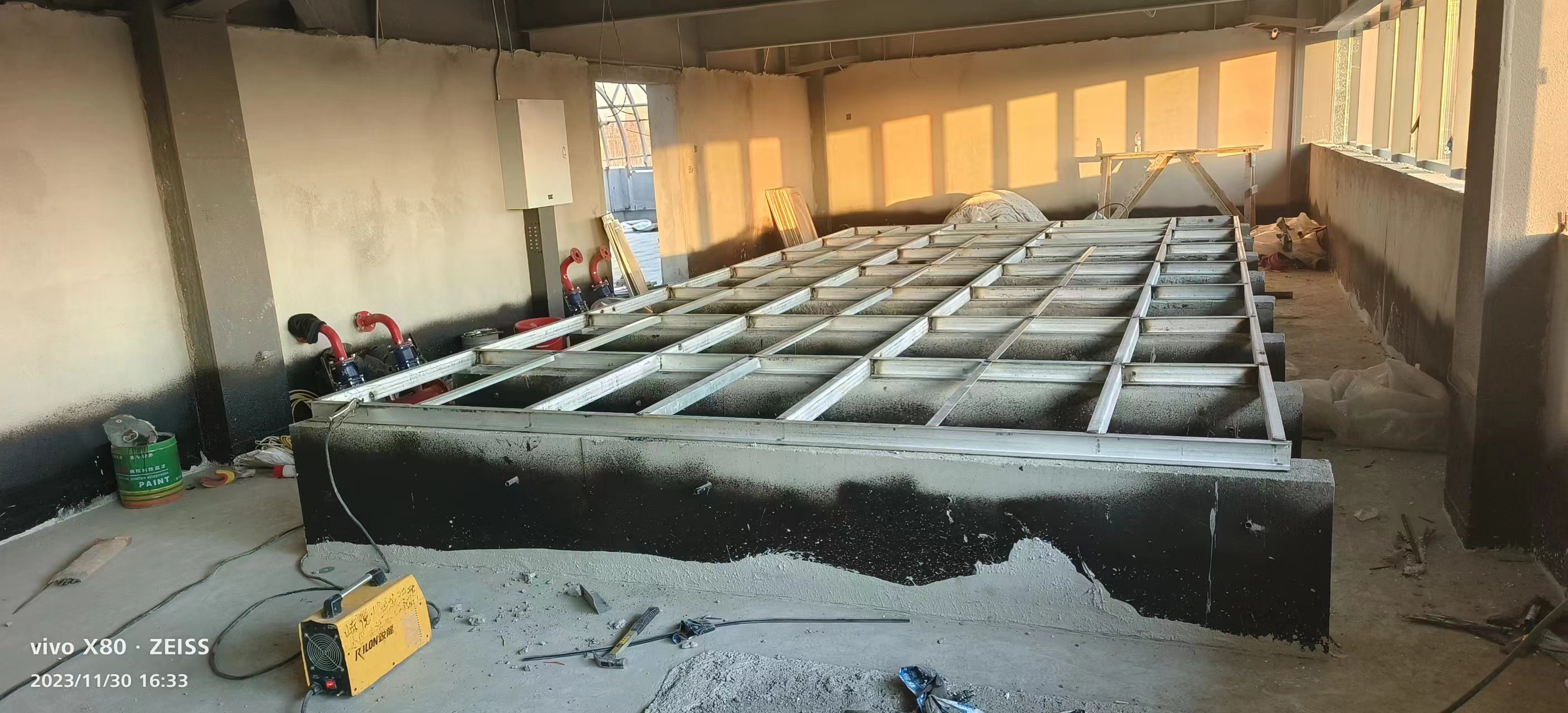 1、槽鋼基礎(chǔ)焊接:工作人員將測量并尋求等通道切割和焊接。制作一個間距為一米的網(wǎng)格式通道底座,以便水箱的順利組裝。