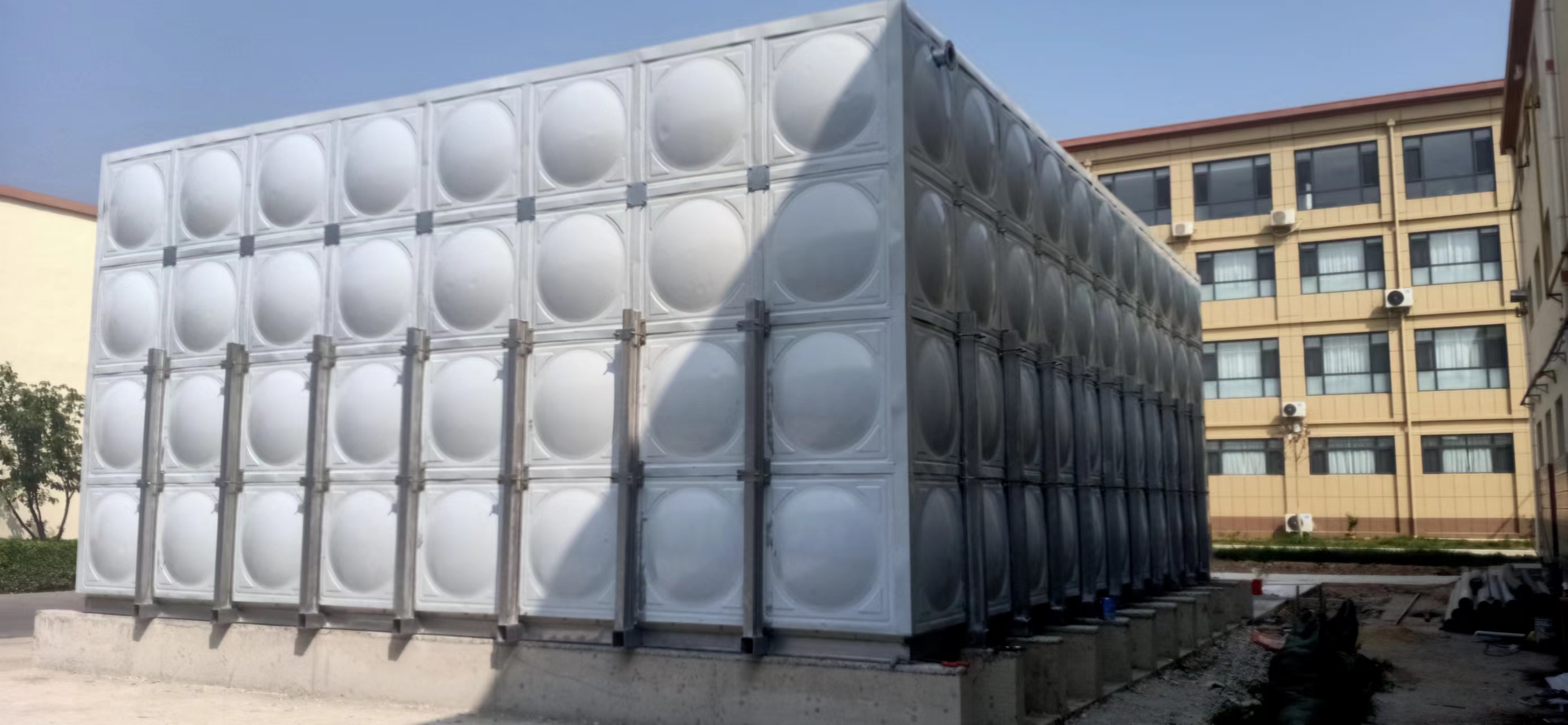 1、玻璃鋼水箱在安裝前 首先要檢查水箱混凝土基礎(chǔ)表面是否平整,然后按照水箱底板尺寸,將已經(jīng)截好的槽鋼進行焊接組合,然后開始組裝水箱板,水箱板與水箱板之間中間夾密封條,以螺栓連接。先將底板組裝完畢平鋪到槽鋼底座上,然后將側(cè)面組合與底部連接。